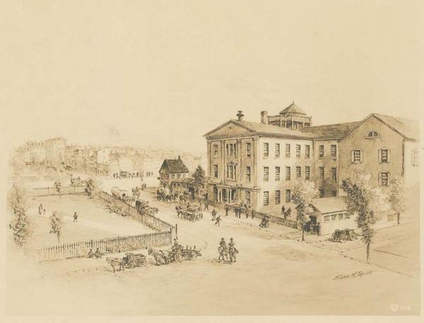 The possibility of obtaining "sun pictures" was known to European scientists in the early period of the eighteenth century, but it remained to Daguerre, one of a group of French experimenters, to produce definite heliographs. When, in 1839, he was pensioned by the French Government, the process was made public and the formula soon reached American scientific bodies. A brief account appeared in the "United States Gazette" of September 25th. Among those few who regarded the discovery seriously was Joseph Saxton, and employee at the Mint upon Chestnut Street. He obtained a small lens and an "exposure" from a rear second-story window of the Mint. This picture, taken upon October 16th, 1839, was the first "heliograph" made in America. He is said, by Dr. Julius Sachse, in his pamphlet report to the Franklin Institute, to have taken other views from the same outlook on the following daw. THis drawaing depicts what the camera "saw," even though but faintly, in those epochal views. Joseph Saxton was an inventor of numerous scientific and mechanical devices. He died at Washington in 1873.