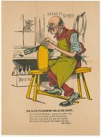 A harness maker is seated in his workshop. "Harness repared' is written on the wall behind him and a crate marked "Beer" is filled with bottles.