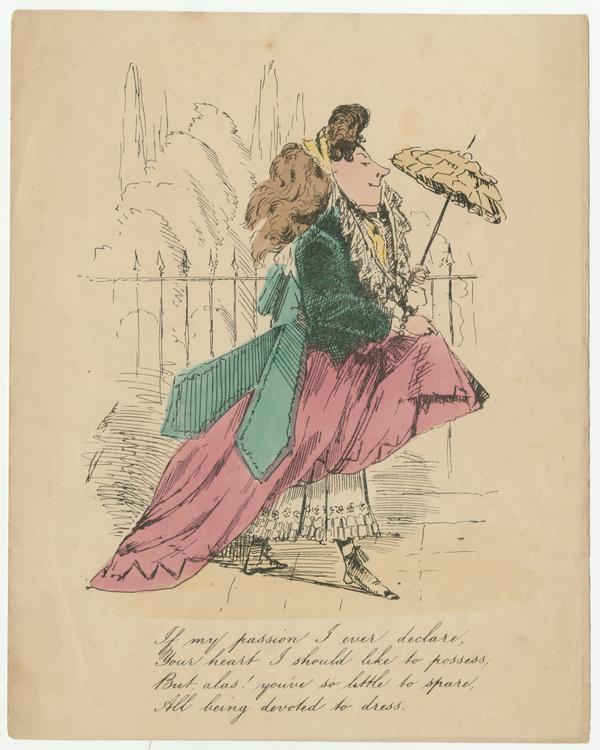 Text: If my passion I ever declare, / Your heart I should like to possess; / But alas! You’ve so little to spare, / All being devoted to dress.