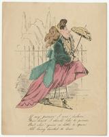 A woman carrying a parasol walkes by an enclosed garden. She is holding the front of her skirt up to reveal lacy undergarment beneath it.