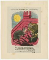 Two cats are on a tiled roof. One has a woman's head. Behind the roof is a man with a face. "To go upon the tiles" means to embark on a drinking or sexual adventure. The valentine accuses the woman of indulging her passions in excess.