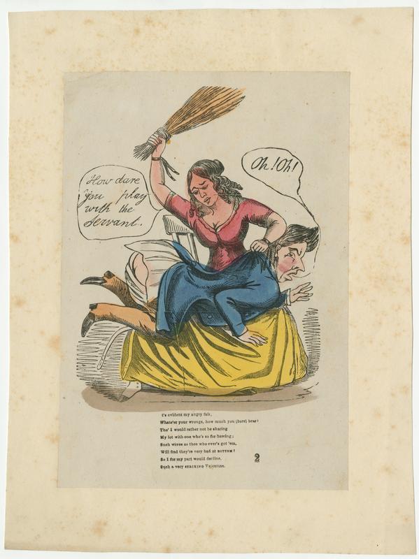The angry woman beats her philandering lover with a broom as he lies across her lap. A speech balloon by her head reads " HOW DARE YOU PLAY WITH THE SERVANT?" as he cries, "Oh! Oh!"