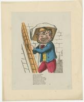 Text: Leering, drunken, dissipated, / Oft I see you elevated, / Not alone upon the ladder, / But in a way that is much sadder, / Your fondness for a “DROP” is such / That you may get a DROP too much / By falling from the ladder top, / Or at the gallows “take a drop.” / A fate that doubtless will be thine, / So, go, be hanged! my Valentine.