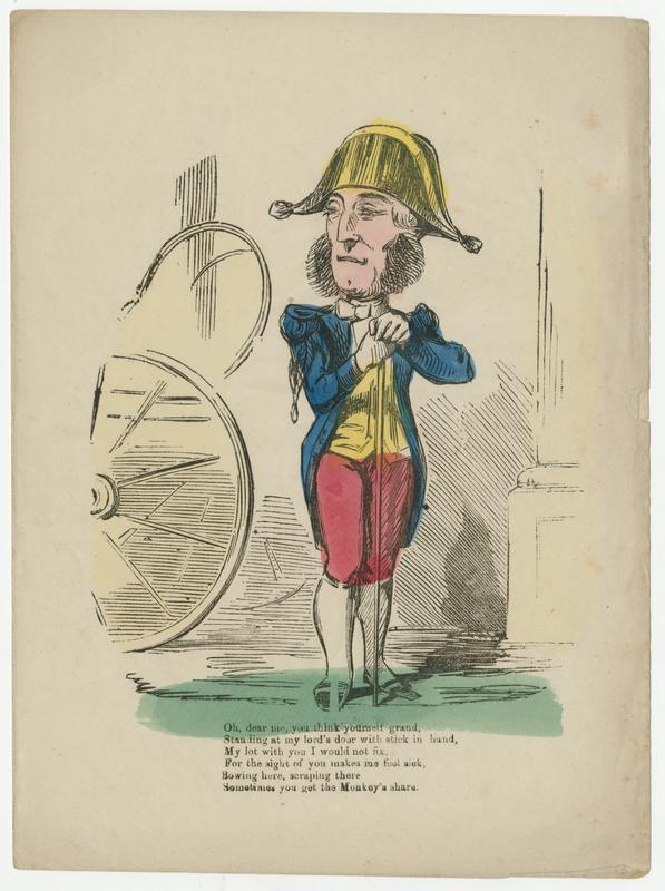 Text: Oh, dear me, you think yourself grand, / Standing et my lord’s door with stick in hand, / My lot with you I would not fix, / For the sight of you makes me feel sick, / Bowing here, scraping there / Sometimes you get the Monkey’s share.