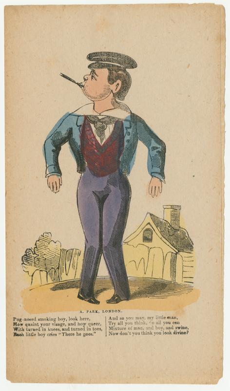 Text: Pug-nosed smoking boy, look here, / How quaint your visage, and how queer, / With turned in knees, and turned in toes, / Rach little boy cries “There he goes.” / And so you may, my little man, / Try all you think, do all you can / Mixture of man, and boy, and swine, / Now don’t you think you look divine?