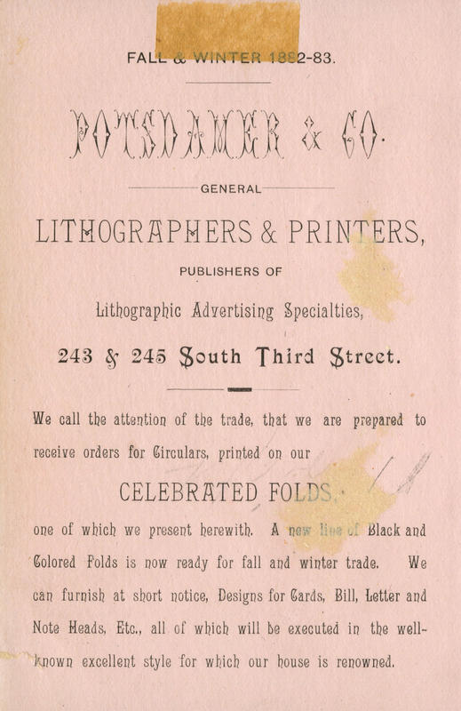 Potsdamer & Co., a Jewish Philadelphia lithographic firm active 1875-1885, was established by Theodore Potsdamer and Alfred Jones as Jones & Potsdamer (321 Chestnut Street) ca. 1872. Jones left the partnership in 1875 and Potsdamer continued operations as Potsdamer & Co. until 1885 (after having relocated to 243 South Third Street in 1882) when the firm was taken over by the Ketterlinus Company due to Potsdamer's declining health. In 1874, Potsdamer & Co. received a silver medal for "engraving sharp, shield panel work, and Spencerian script," but was reported as losing considerable money for work for the Centennial Exhibition of 1876. Potsdamer & Co. predominately produced chromolithographic trade cards and other advertising ephemera in addition to letterpress work, mostly for benevolent organizations of the local Jewish community. Organizations included the Society of the United Hebrew Charities of Philadelphia, Jewish Hospital Association of Philadelphia, and Jewish Foster Home and Orphan Asylum of Philadelphia.