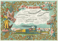 William F. Scheible, born ca. 1822 in Pennsylvania, was a stencil cutter and awning maker, who also practiced lithography during the late 1850s. Scheible operated his establishment from 47-49 South Third Street, which he advertised through an 1859 chromolithographed trade card and broadside illustrated with designs by Philadelphia engraver and lithographer Frederick J. Pilliner. Scheible operated the business until ca. 1876 and his death when his wife Elizabeth (b. ca. 1837) assumed operations of the business that was reestablished as Scheible & Co. Scheible also exhibited embossed cards praised for their "beautiful execution" at the 1856 Franklin Institute Exhibition of American Manufacturers; earned enough income to be taxed during the Civil War; and in the 1870 census reported personal estate valued at $3,000 (i.e., $51,000 in 2008) in addition to his wife's real estate valued at $7,000.