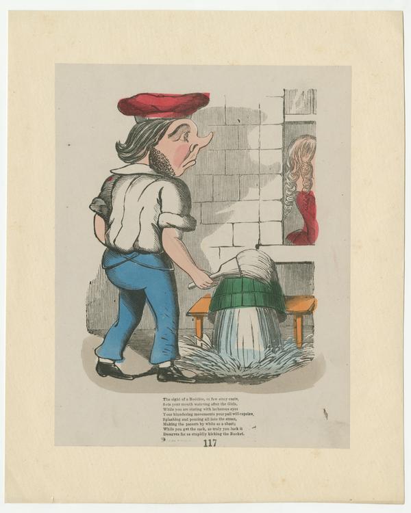 Text: The sight of a Boddice, or few stray curls, / Sets your mouth watering after the Girls, / While you are staring with lecherous eyes / Your blundering movements your pail will capsize, / Splashing and pouring all into the street, / Making the passers by white as a sheet; / While you get the sack, as truly you luck it / Deserves for so stupidly kicking the Bucket.