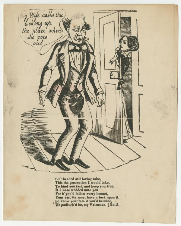 Text: Soft headed self loving rake, / This the precaution I would take, / To bind you fast, and keep you true, / If I were wedded unto you. / For if you’d follow every bonnet, / Your TRUNK must have a lock upon it. / So know your fate if you’d be mine, / To padlock’d be, my Valentine.