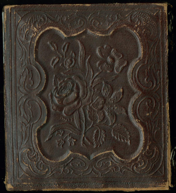 Case: Leather. On front: One rose in center surrounded by leaves and other flowers within a nonpareil like border. On verso: