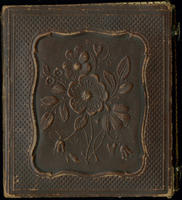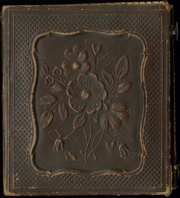 Case: Leather. On front: One rose in center surrounded by leaves and other flowers within a nonpareil like border. On verso: