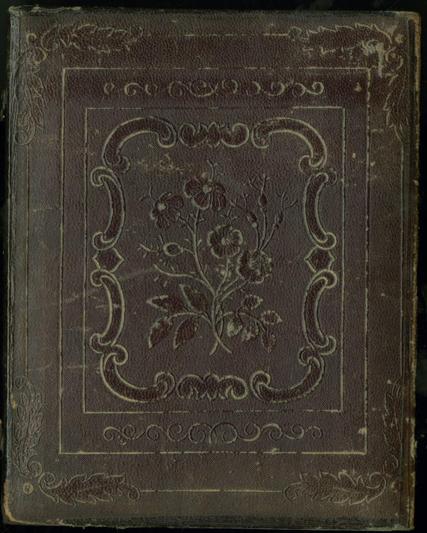 Case: Leather. Lacking cover. Spray of roses in a square border. The design of the case is called The Delicate Roses, variant