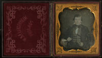 Portrait probably photographed by African American photographer Glenalvin J. Goodridge and placed in a Langenheim case. Shows a seated man resting his arm on a book on a table covered in a Firebird tablecloth. In his other hand he holds what appears to be a closed daguerreotype case. He wears a jacket, vest, high-collared shirt and large necktie.