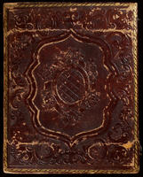 Case: Leather. A small oval surrounded by leaves and flowers is within a modified nonpareil like border. Scroll work all around. |