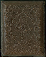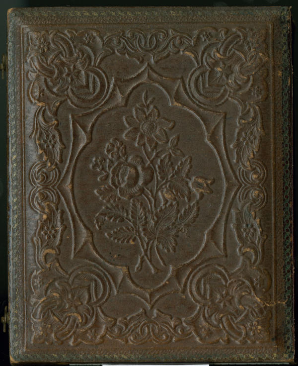 Case: Leather. A spray of mixed flowers is within an ornamented octagonal border. All around the case are scrolls and leaves,