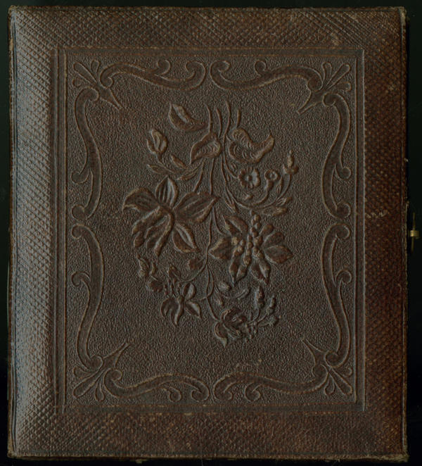 Case: Leather. Within a fancy nonpareil-like border is a spray of mixed flowers. No design on verso. |