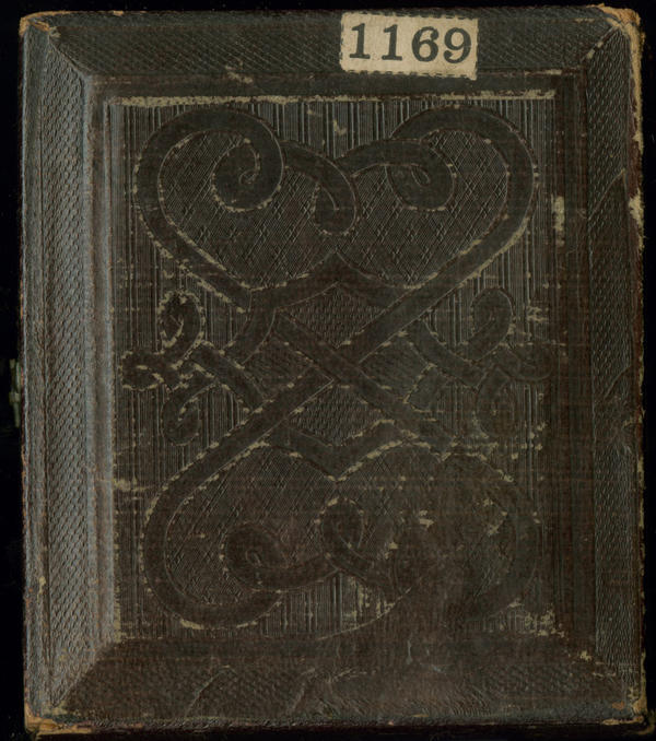Case: Leather. One rose and one bud in a nonpareil-like border. Geometric design on back |