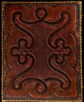 Case: Leather. Geometric design with interlocking swirls. Same design on verso. Double clasp. Accompanied by manuscript note