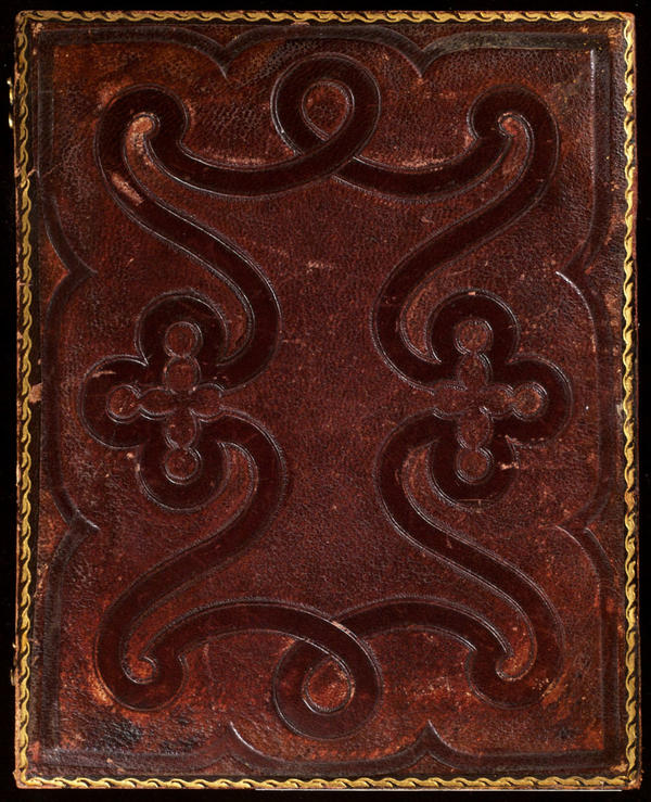 Case: Leather. Geometric design with interlocking swirls. Same design on verso. Double clasp. Accompanied by manuscript note