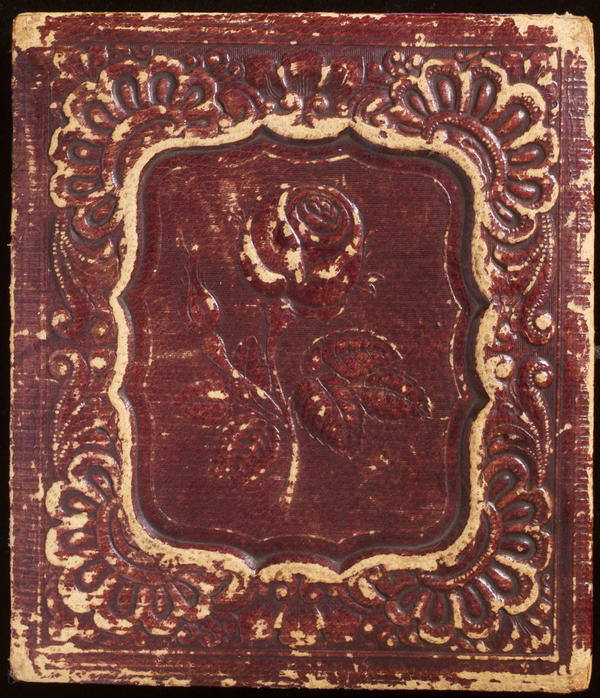 Case: Leather. One rose and one bud in a nonpareil-like border. Geometric design on verso. |