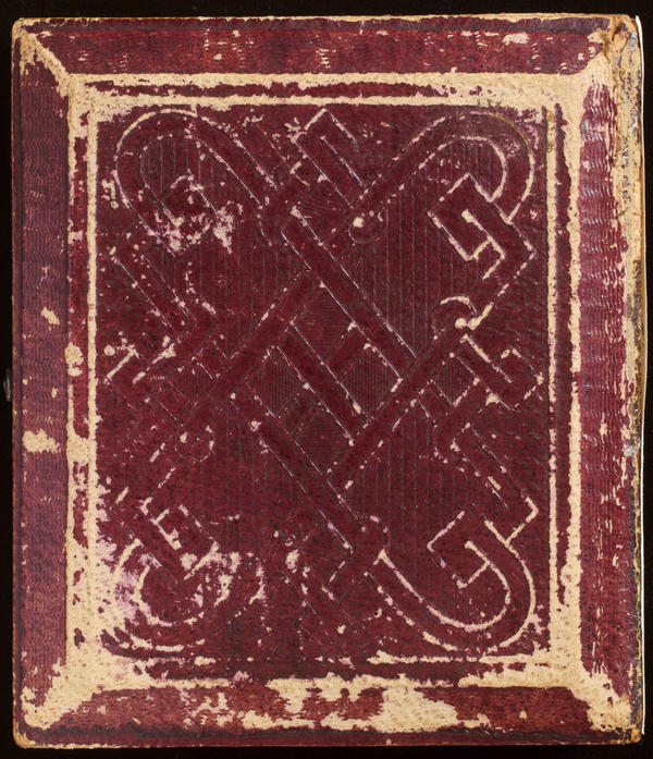 Case: Leather. One rose and one bud in a nonpareil-like border. Geometric design on verso. |