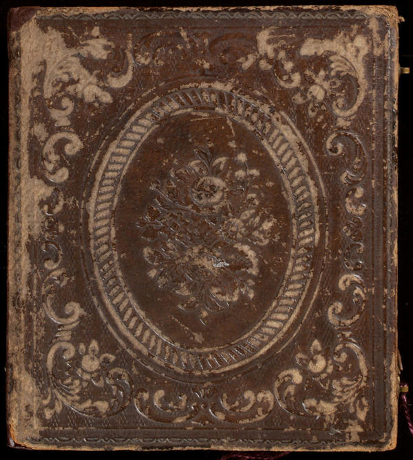 Case: Leather. Two roses and other flowers within an oval in the center. Scrolls at the corners. |