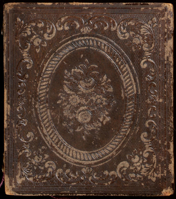 Case: Leather. Two roses and other flowers within an oval in the center. Scrolls at the corners. |