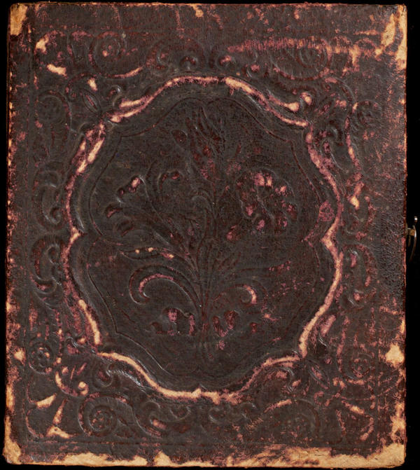 Case: Leather. Spray of three tulips within a nonpareil-like border. Geometric design on verso. |