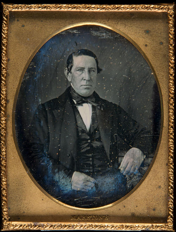 [Portrait of an unidentified man wearing a black satin vest with his left arm is resting on a book on a table.] [graphic] / Marston's.
