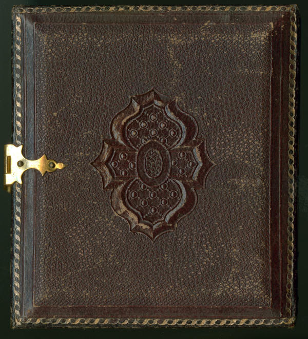 Case: Leather. Geometric with cross hatch design. Different geometric design on verso with small oval in the center. |