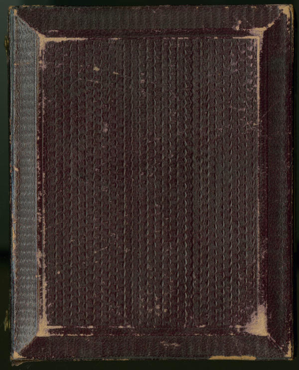 Pad: Red velvet. Photographer's embossed imprint in the center is torn and illegible. Geometric border all around. |