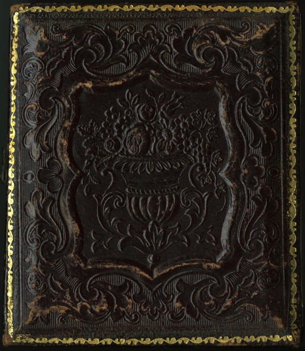 Case: Leather. In center, an urn overflowing with flowers and leaves within a modified nonpareil border. The design of the