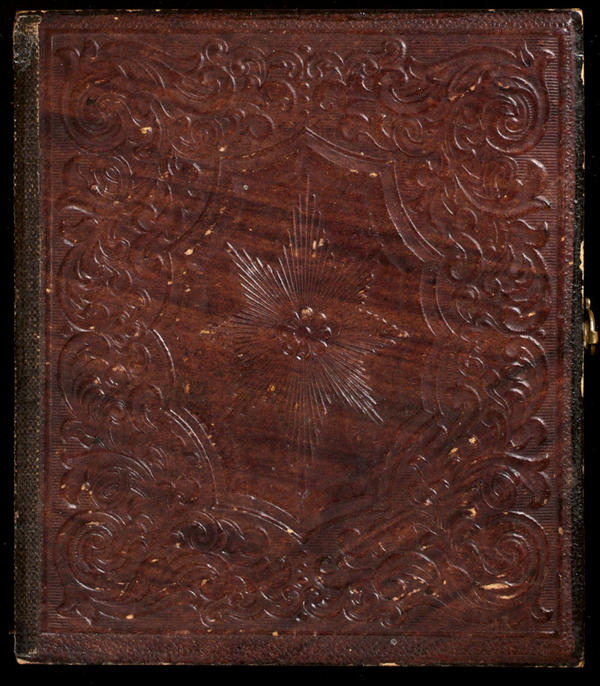 Case: Leather. In center a striated eight pointed star. Fancy scroll work all around. Same design on verso. |