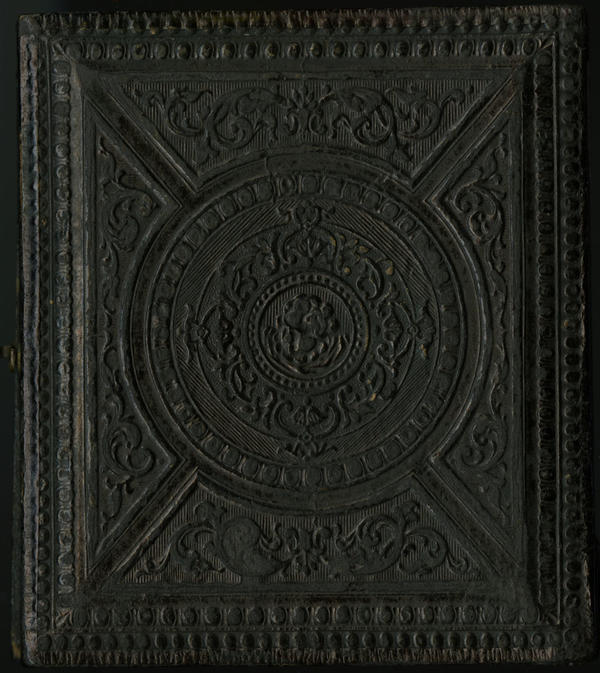 Case: Leather. In center a striated eight pointed star. Fancy scroll work all around. Tangent circle design on verso. |