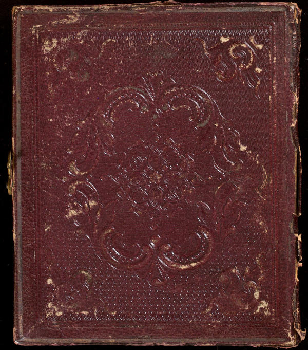 Case: Leather. Lacking cover. Small geometric design in center surrounded by scrolls. Fancy scrolls at each corner. |