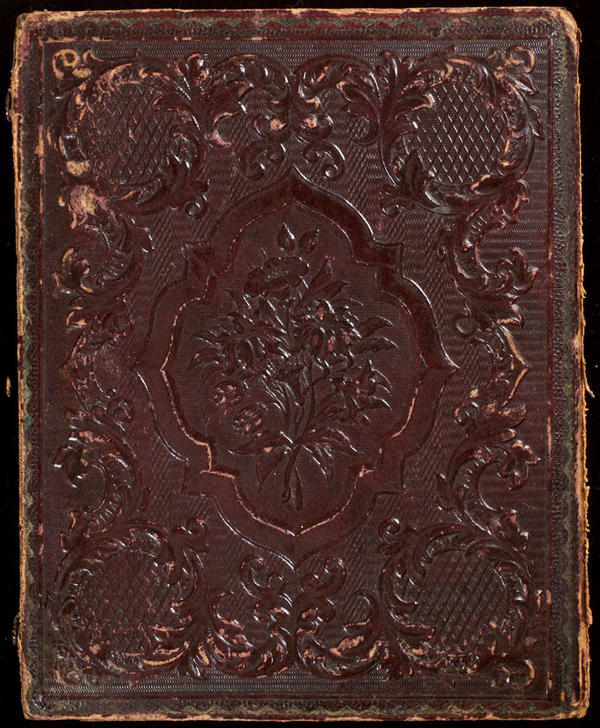 Case: Leather. Floral spray within a curved octagon. Ornate scrolls work all around. Same design on verso. |