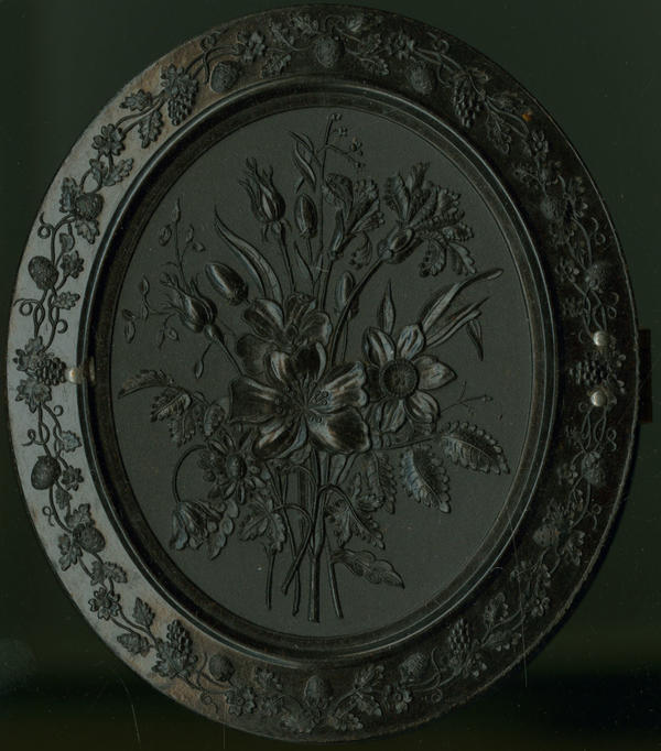 Case: Oval thermoplastic with elaborate floral design in center and a vine border. Same design on back. |