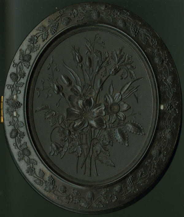 Case: Oval thermoplastic with elaborate floral design in center and a vine border. Same design on back. |