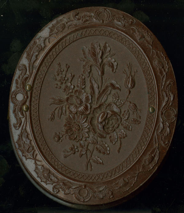 Case: Oval thermoplastic. Spray of mixed flowers and leaves, with one prominent rose. Same design on verso. |