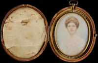 Bust-length, hand-painted full face minature pendant of lovely Marjorie Vaughan Lea wearing a low cut white lacy dress. Her