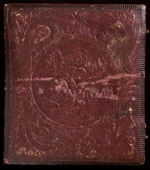 Case: Leather. Three roses in a circle surrounded by scrolls and leaves. Same design on verso. |