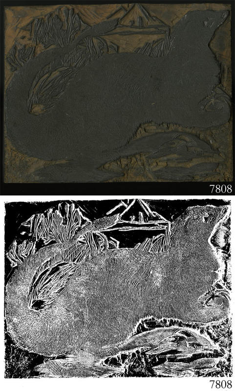 Woodblock for printing an illustration of an unidentified mammal, possibly an otter. |
