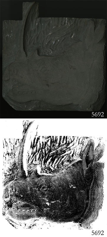 Woodblock for printing an illustration of the head of a rhinoceros.
