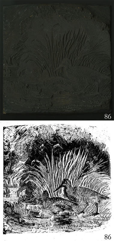 Woodblock for printing an illustration of two unidentified waterfowl. |