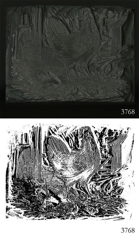 Woodblock for printing an illustration of a hen.