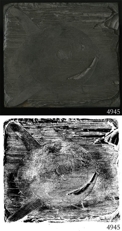 Woodblock for printing an illustration of an unidentified fish, possibly an angelfish. |