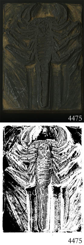 Woodblock for printing an illustration of a scorpion [?]