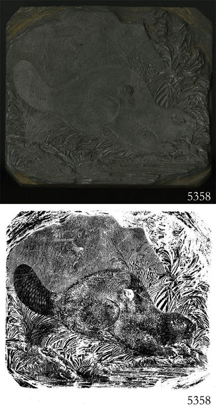 Woodblock for printing an illustration of a beaver. |