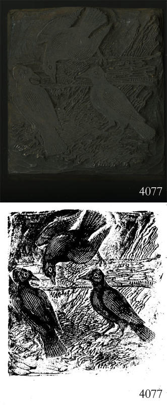 Woodblock for printing an illustration of three birds, possibly crows [?]