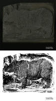 Woodblock for printing an illustration of a rhinoceros.